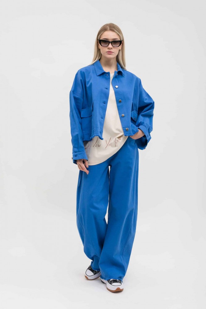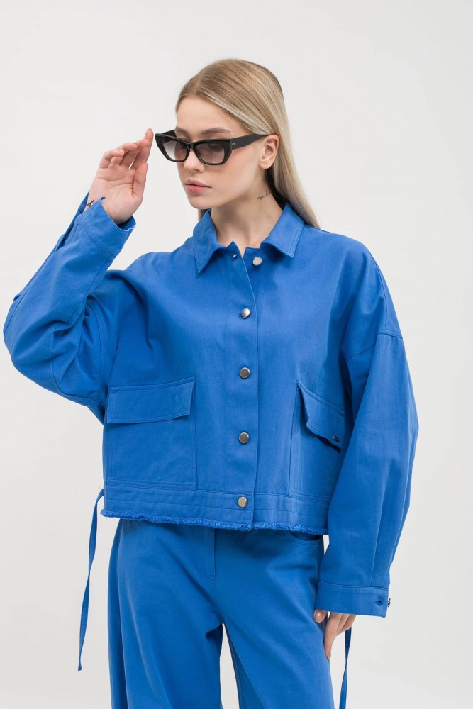 Куртка з котону з еластаном. Модель вільного силуету зі спущеними плечами, відкладним коміром, довгим рукавом з манжетом із застібкою та накладними кишеніми з клапанами спереду.