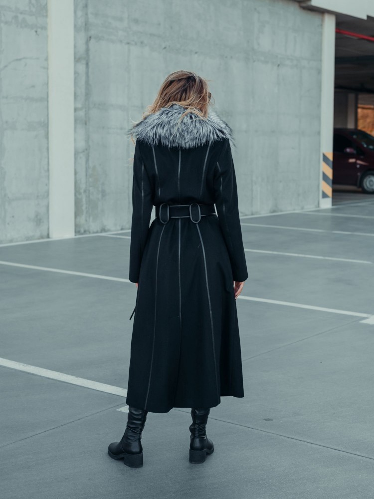 Оздоблення коміра виконано зі знімного, натурального хутра чорнобурки.