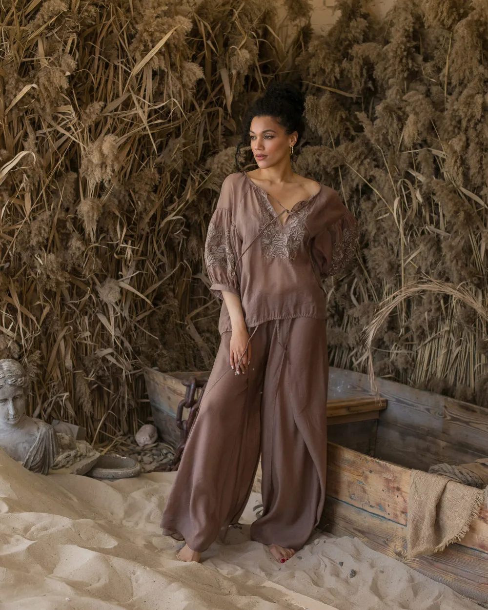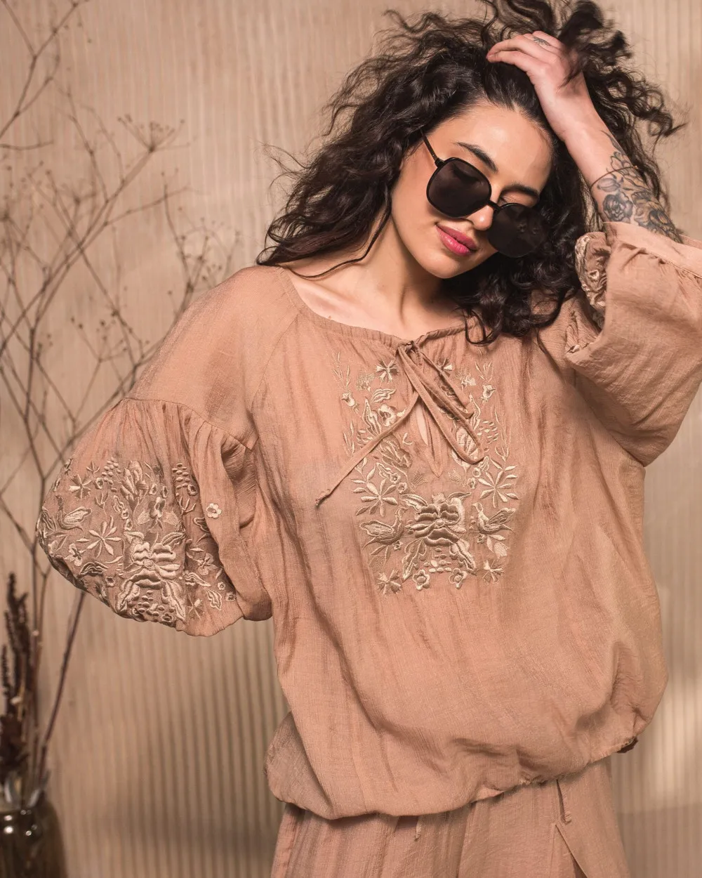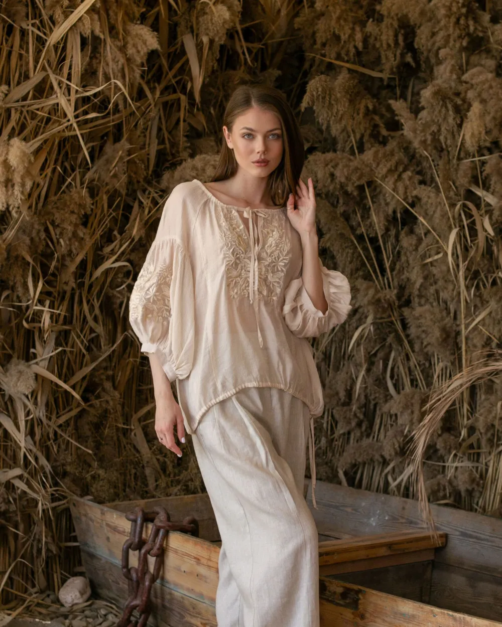 Блуза - вишиванка об'ємного силуету. Рукав - реглан зі спущеною лінією плеча з буфами довжиною три чверті. Вишитий квітковий орнамент на поличці та рукавах. Фігурна лінія низу з подовженою спинкою. Ширина горловини регулюється шнурком. Ширина блузи внизу також регулюється куліскою. Блуза виготовлена з повітряної віскозної тканини з легким ефектом жниварки.