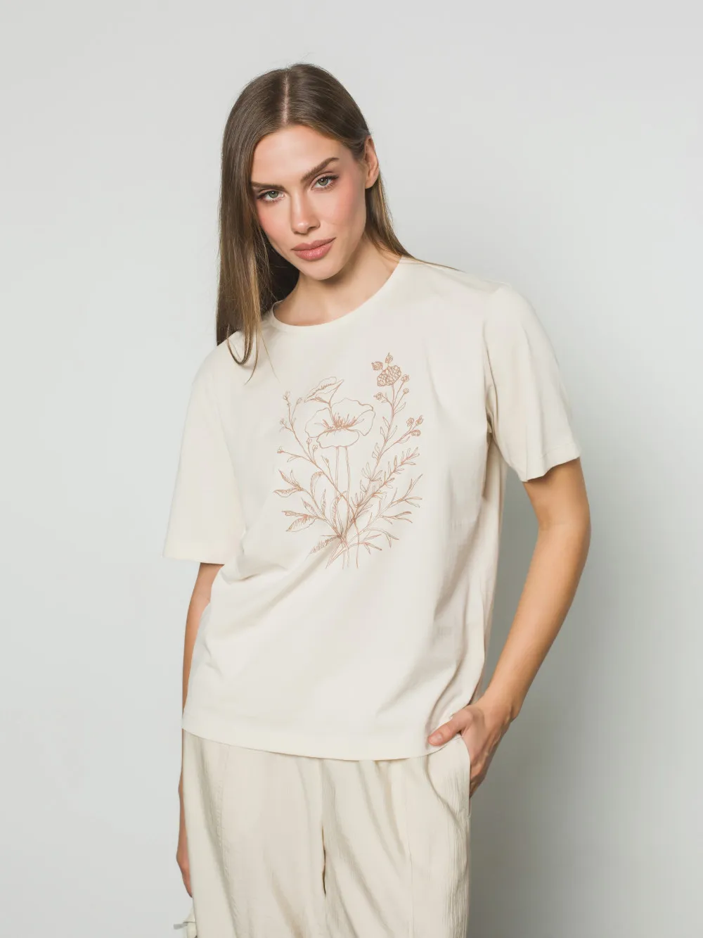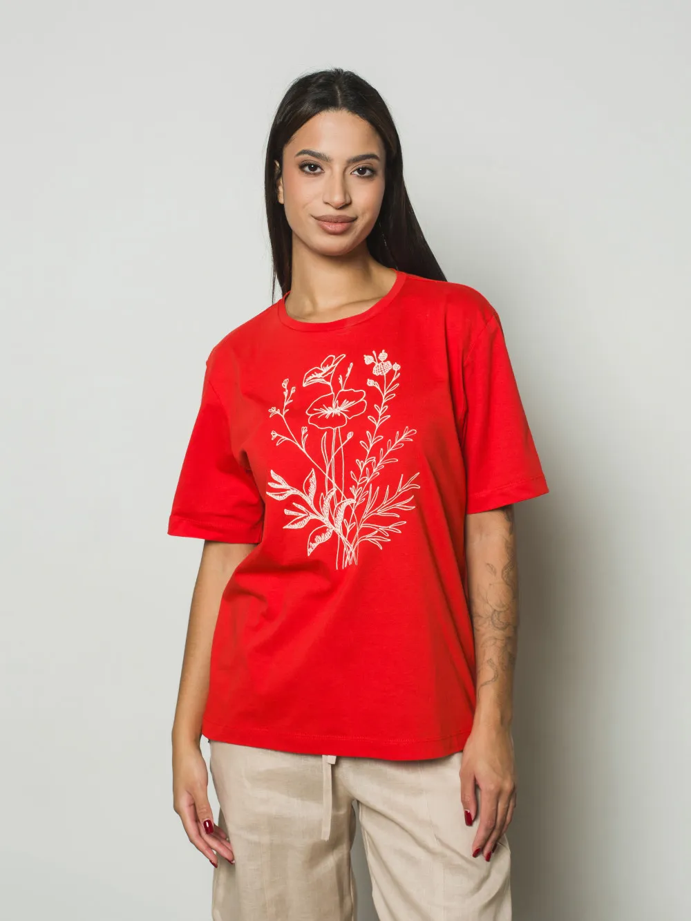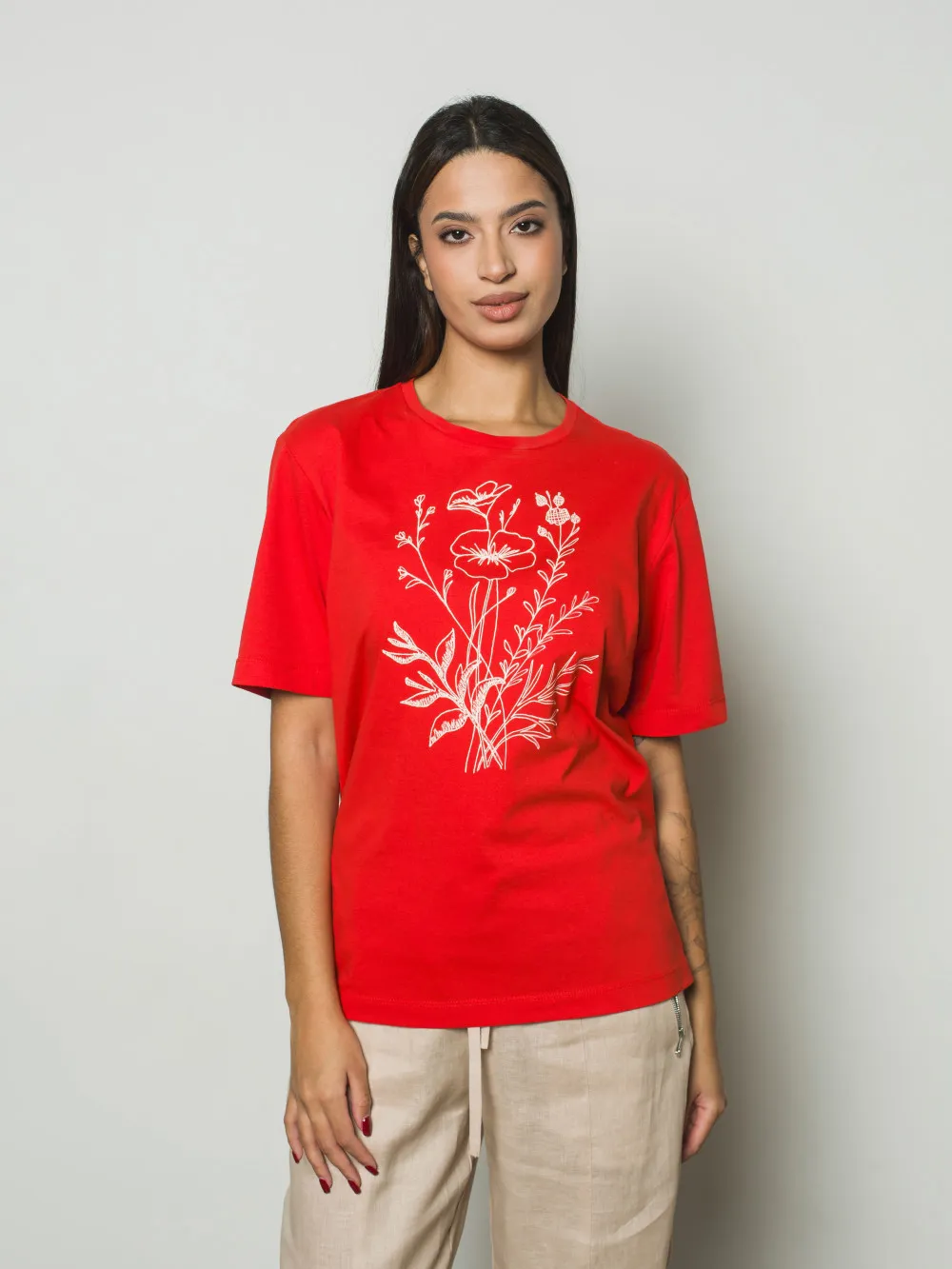 Вільна футболка прямого крою виготовлена з високоякісної натуральної бавовни, що забезпечує бездоганну повітропроникність та комфорт протягом усього дня. Лаконічний силует виробу стає ідеальним фоном для головного акценту — авторського квіткового орнаменту, нанесеного вручну. Ручний розпис робить кожну футболку унікальною, додаючи базовій моделі особливої цінності та індивідуальності. Матеріал приємний до тіла, стійкий до зношування та добре зберігає форму. Така модель легко інтегрується у повсякденний гардероб, додаючи художнього акценту образам із джинсами, спідницями або штанами у стилі casual.