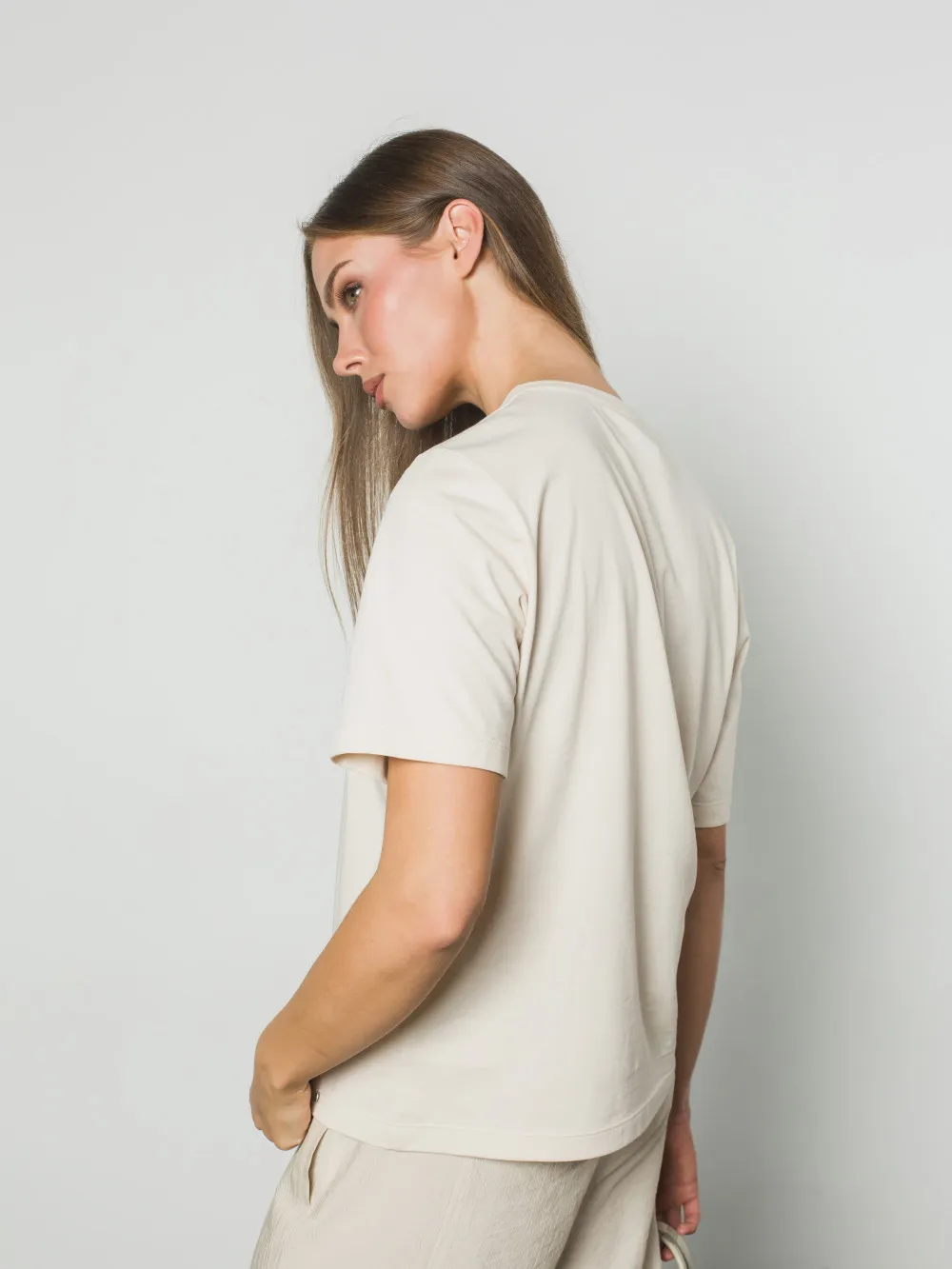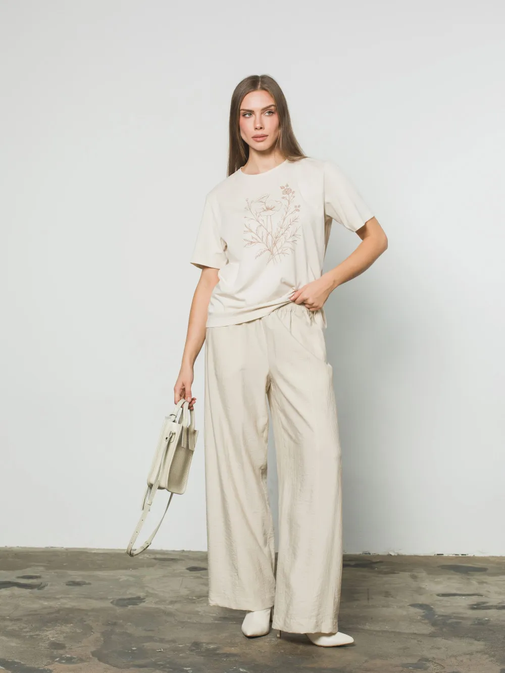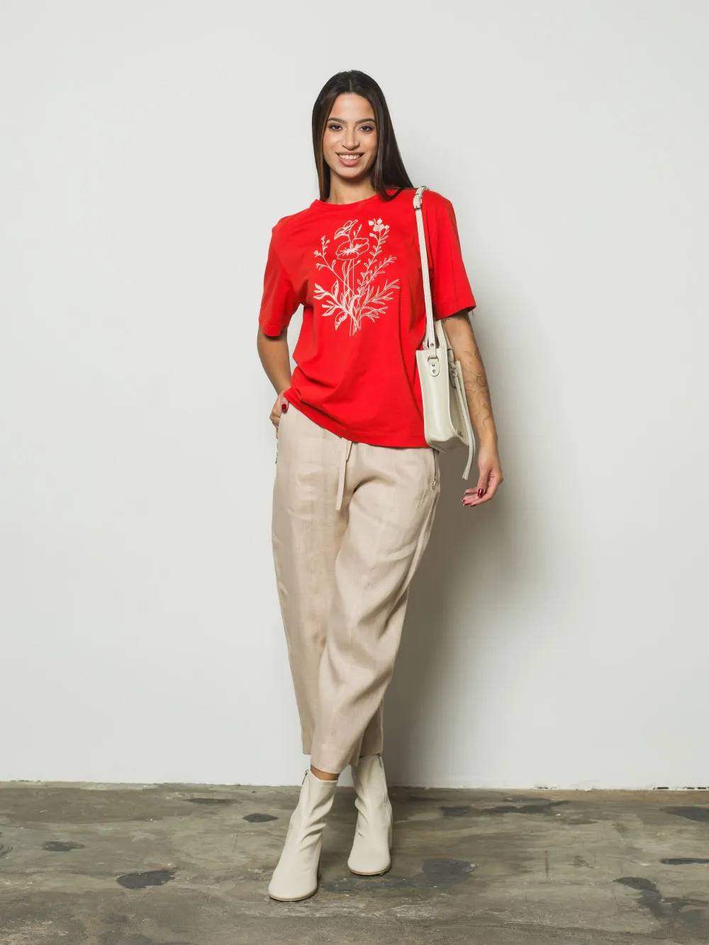 Вільна футболка прямого крою виготовлена з високоякісної натуральної бавовни, що забезпечує бездоганну повітропроникність та комфорт протягом усього дня. Лаконічний силует виробу стає ідеальним фоном для головного акценту — авторського квіткового орнаменту, нанесеного вручну. Ручний розпис робить кожну футболку унікальною, додаючи базовій моделі особливої цінності та індивідуальності. Матеріал приємний до тіла, стійкий до зношування та добре зберігає форму. Така модель легко інтегрується у повсякденний гардероб, додаючи художнього акценту образам із джинсами, спідницями або штанами у стилі casual.