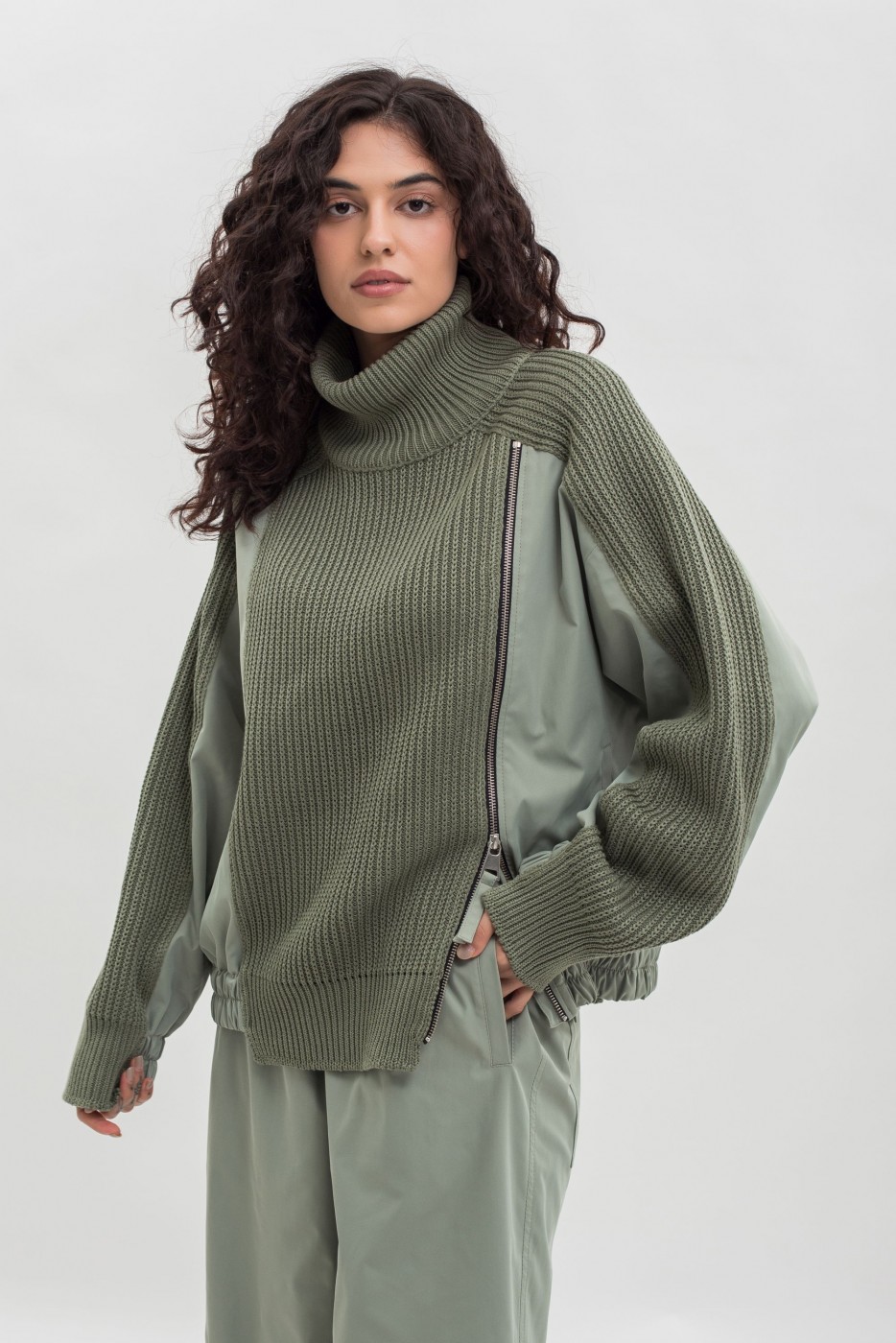 Джемпер в'язаний комбінований з котоном. Модель вільного силуету з високим коміром - стойкою та металевою блискавкою, що розстібається знизу доверху.