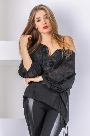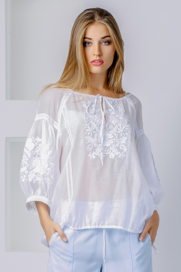 Блуза - вишиванка об'ємного силуету. Рукав - реглан зі спущеною лінією плеча з буфами довжиною три чверті. Вишитий квітковий орнамент на поличці та рукавах. Фігурна лінія низу з подовженою спинкою. Ширина горловини регулюється шнурком. Ширина блузи внизу також регулюється куліскою. Блуза виготовлена з повітряної віскозної тканини з легким ефектом жниварки.