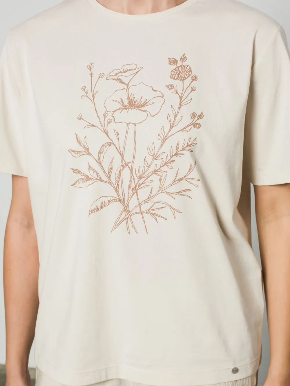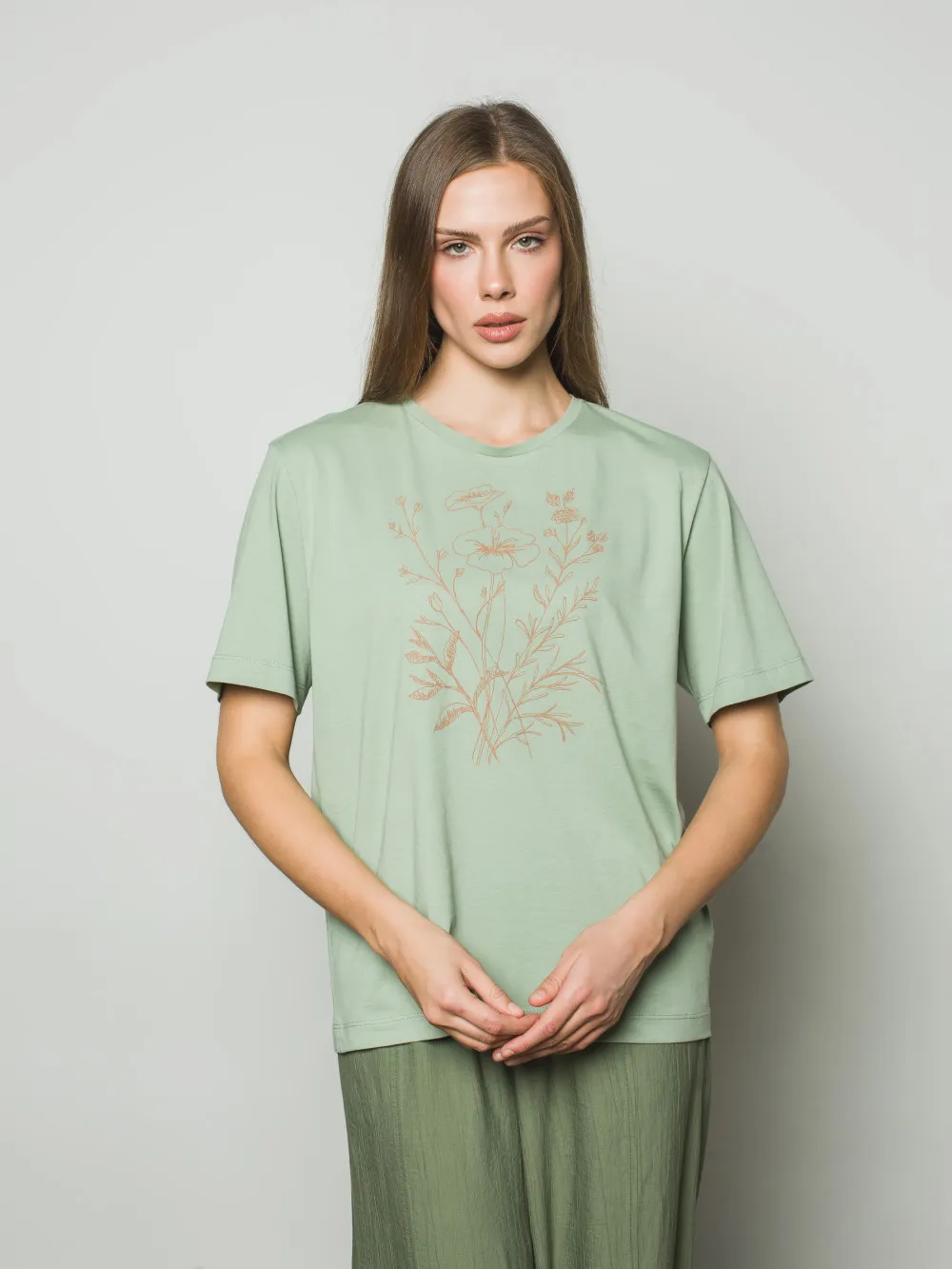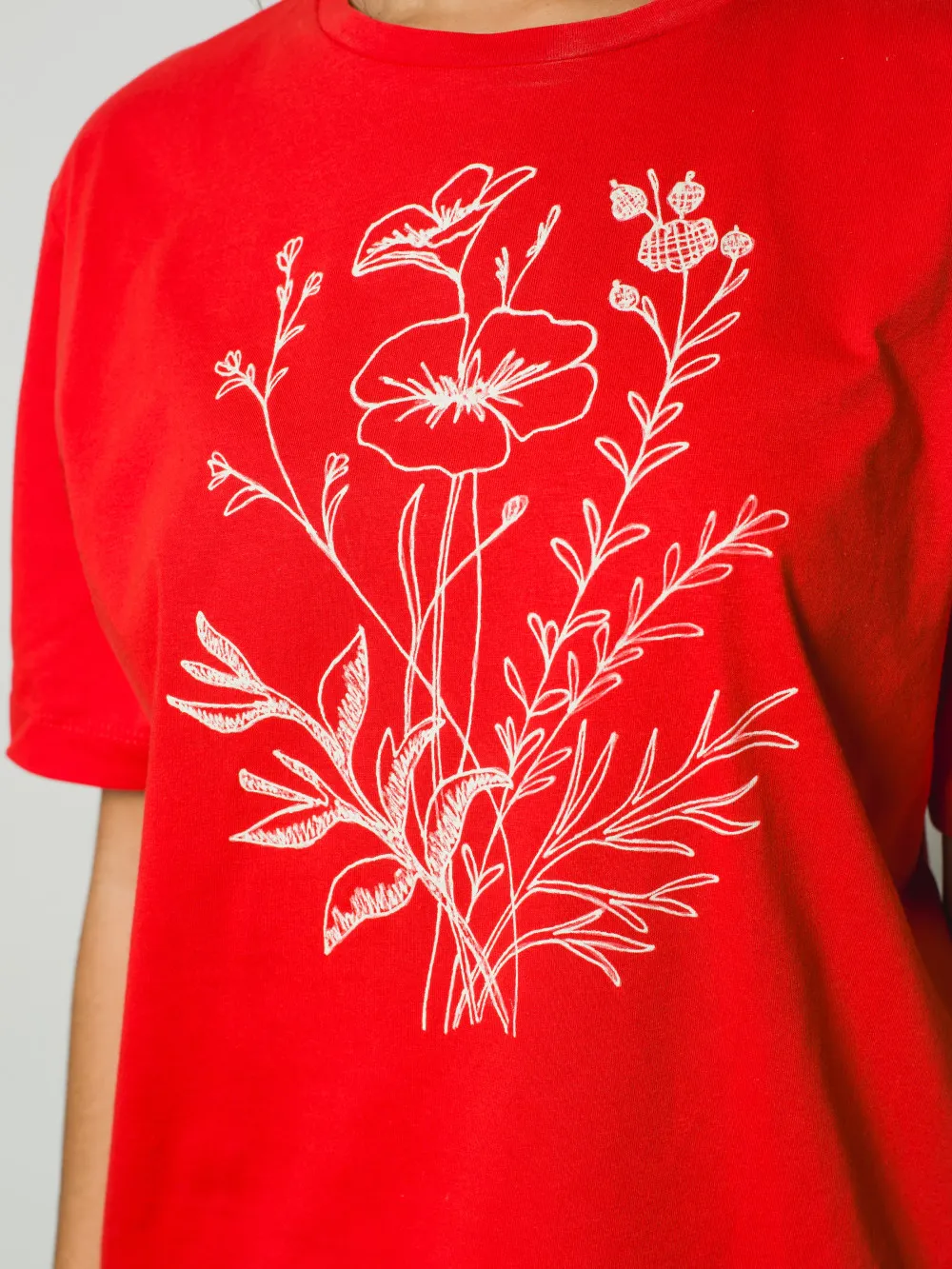 Вільна футболка прямого крою виготовлена з високоякісної натуральної бавовни, що забезпечує бездоганну повітропроникність та комфорт протягом усього дня. Лаконічний силует виробу стає ідеальним фоном для головного акценту — авторського квіткового орнаменту, нанесеного вручну. Ручний розпис робить кожну футболку унікальною, додаючи базовій моделі особливої цінності та індивідуальності. Матеріал приємний до тіла, стійкий до зношування та добре зберігає форму. Така модель легко інтегрується у повсякденний гардероб, додаючи художнього акценту образам із джинсами, спідницями або штанами у стилі casual.