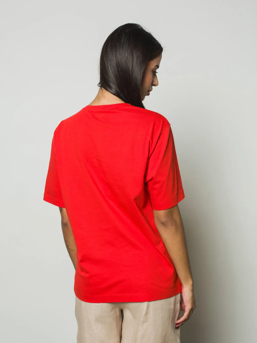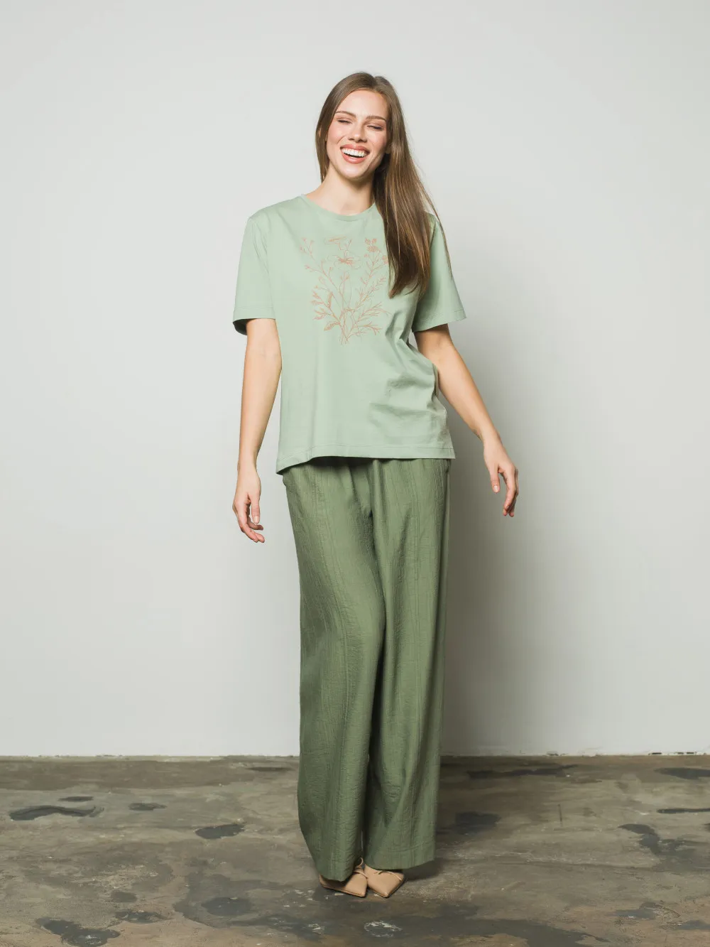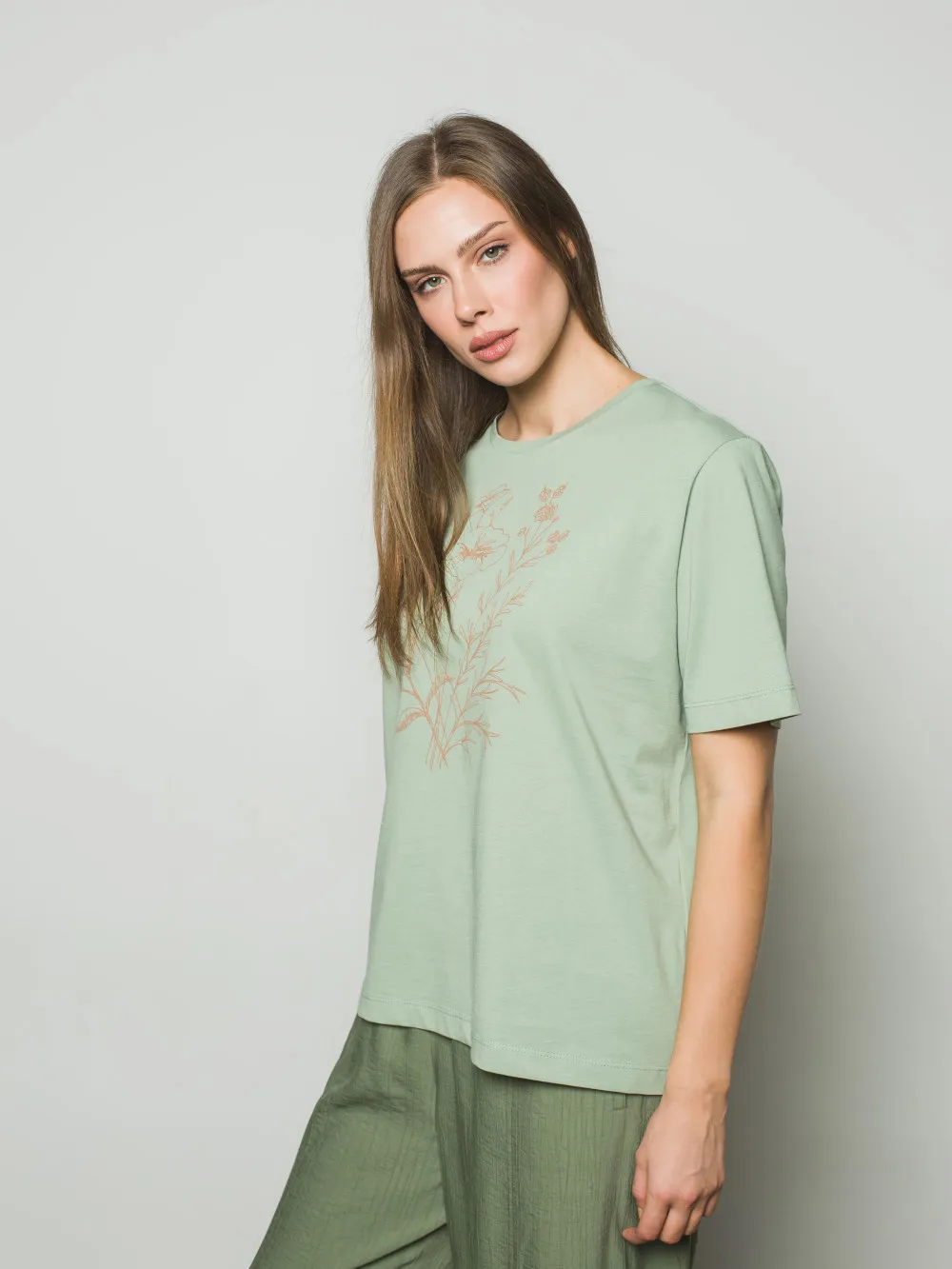 Вільна футболка прямого крою виготовлена з високоякісної натуральної бавовни, що забезпечує бездоганну повітропроникність та комфорт протягом усього дня. Лаконічний силует виробу стає ідеальним фоном для головного акценту — авторського квіткового орнаменту, нанесеного вручну. Ручний розпис робить кожну футболку унікальною, додаючи базовій моделі особливої цінності та індивідуальності. Матеріал приємний до тіла, стійкий до зношування та добре зберігає форму. Така модель легко інтегрується у повсякденний гардероб, додаючи художнього акценту образам із джинсами, спідницями або штанами у стилі casual.