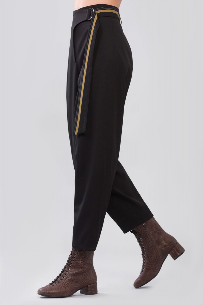 Штани - банани із завищеною лінією талії. На боці контрастні поздовжні смуги візуально подовжують силует. Фігурна форма гульфіка, що переходить у пояс. Довжина по щиколотку. Виконані із костюмної тканини середньої щільності. Образ доповнить сорочка із тієї ж серії.
