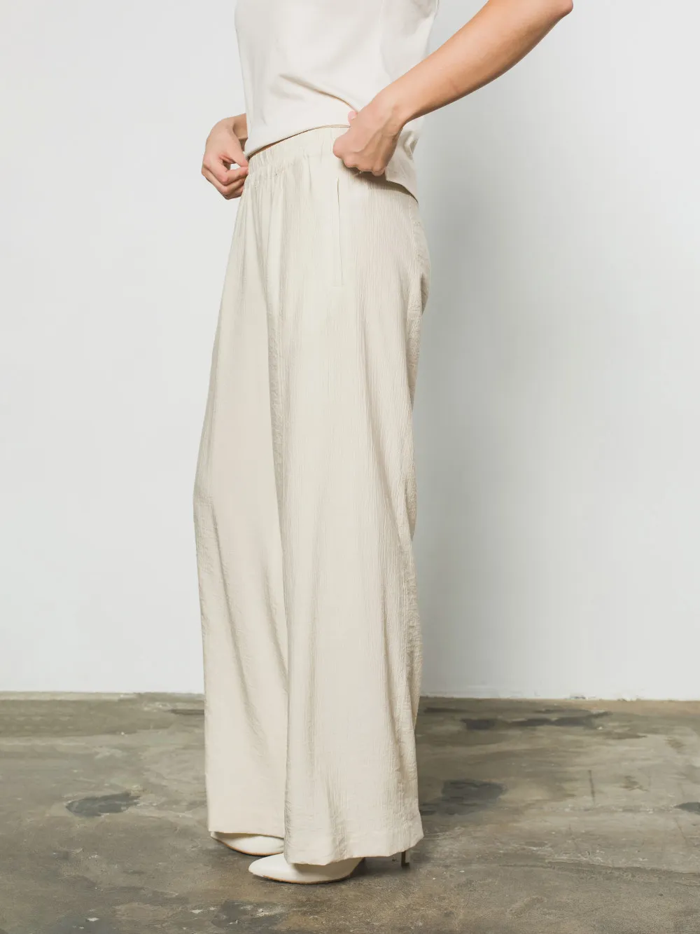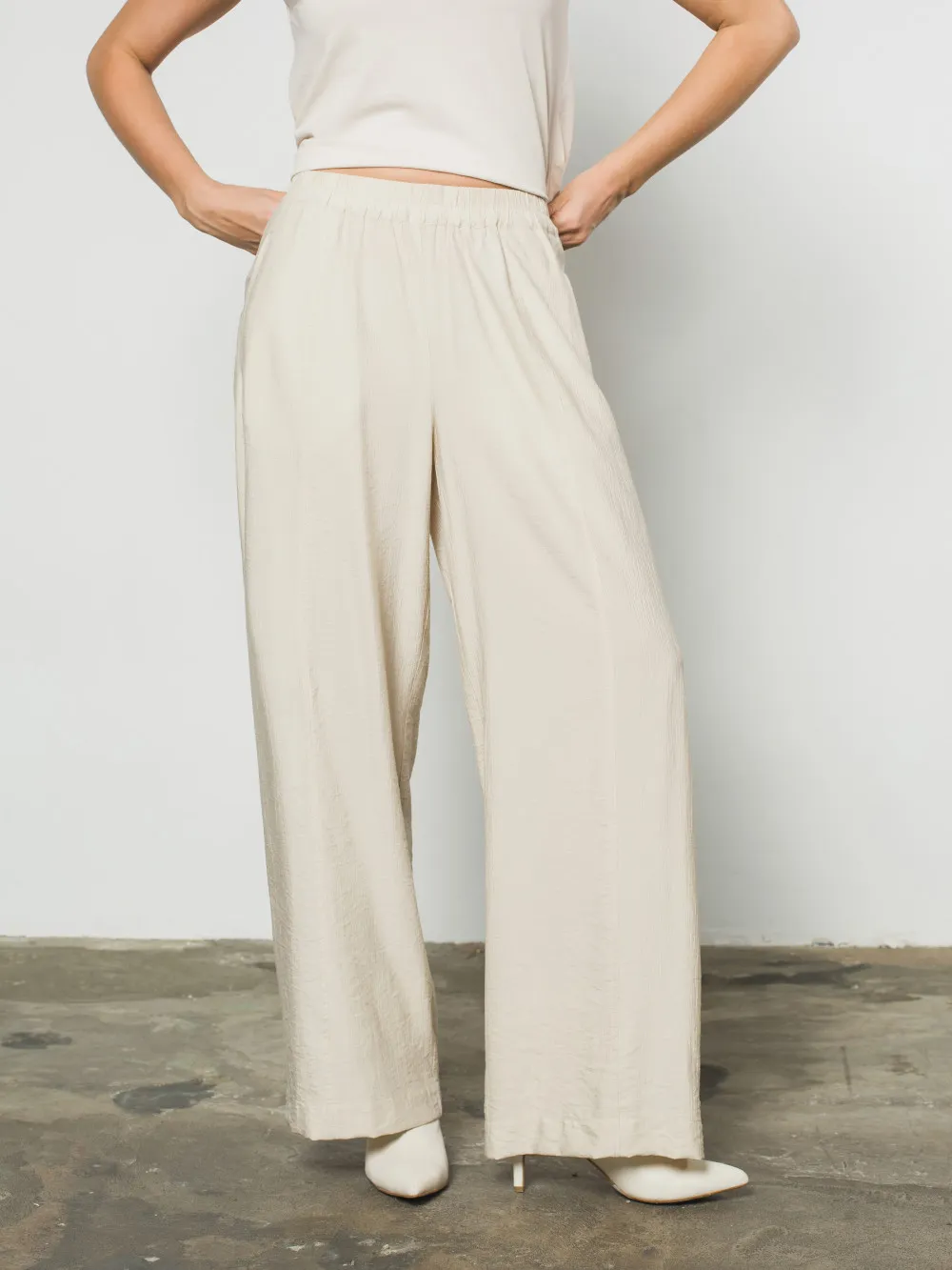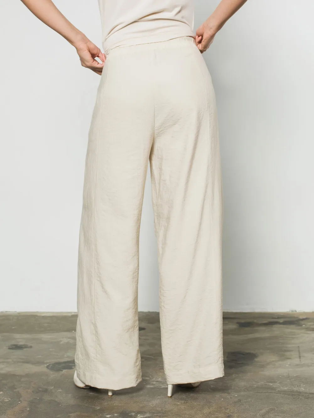 Штани прямого вільного силуету виготовлені з жатої віскози, що забезпечує матеріалу виразну фактуру, легкість та приємне відчуття прохолоди. Модель має еластичний пояс на резинці для максимально комфортної посадки та функціональні кишені з боків. Головною конструктивною особливістю є поздовжні рельєфи вздовж передньої частини штанин, які візуально витягують силует і додають виробу структурної чіткості. Це універсальний елемент літнього гардероба, який гармонійно поєднується як із жилетом із цієї ж серії, так і з базовими топами чи футболками.
