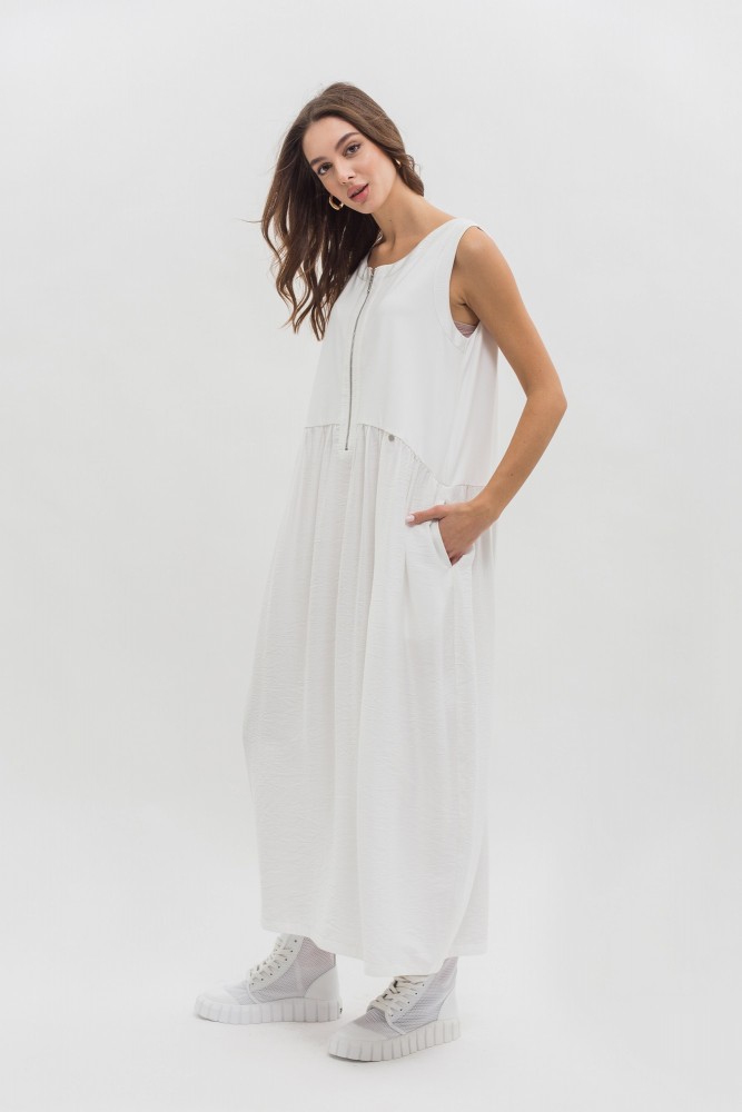 Довга сукня без рукавів комбінована з двох тканин: трикотажні верх та спідниця з віскозної жатої тканини. Вільний силует із завищеною лінією талії та широкою спідницею зі зборками.