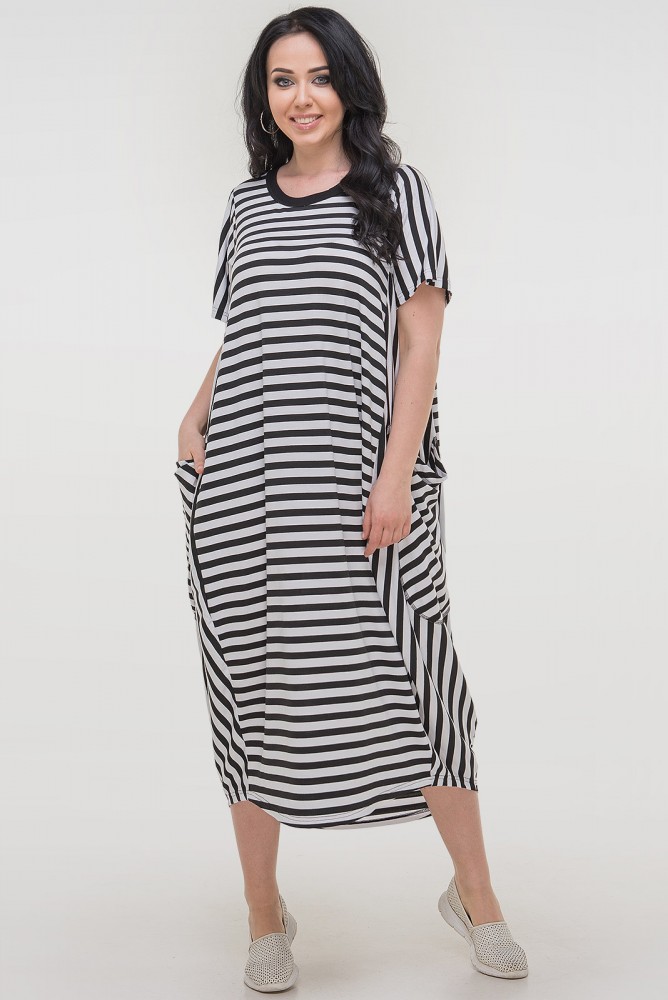 Летнее платье в стиле оверсайз выполнено из вискозного трикотажа в черно-белую полоску. Оригинальный крой и чередование направления полосок позволит Вам выделиться из толпы. Накладные вместительные кармана и горловина декорированы накладным отделочным швом. Свободный силует скроет недостатки фигуры и будет особенно удобен в летнюю жару. Вырез округлый, рукав короткий. Подойдет барышням любого возраста с размером 44-64.