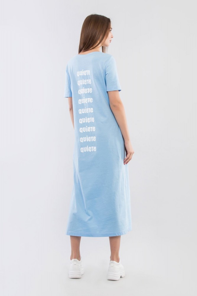Сукня – футболка прямого силуету довжиною міді. Виконано із тонкого бавовняного трикотажу. Виріз човника, втачний прямий рукав, високий розріз на лівому боці, на грудях та на спині ручний розпис. Образ доповнить взуття у спортивному стилі.