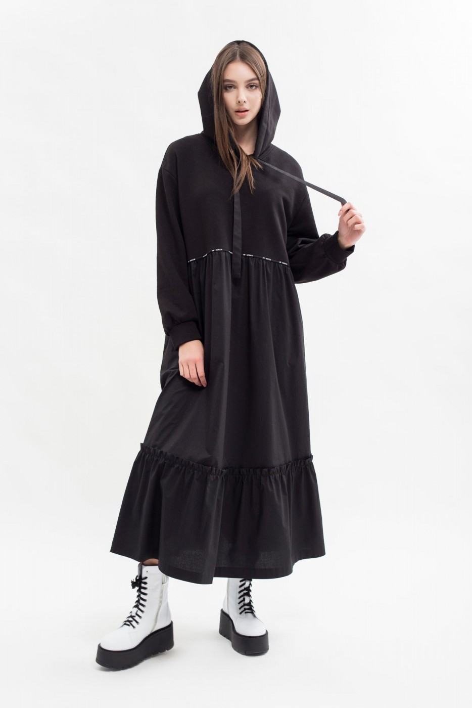 Оригінальна сукня - худи з бавовняного трикотажу та попліну.Модель oversize силуету оформлена спущеною лінією плеча, об'ємним капюшоном та фірмовим пайпінгом з лого.Модель доповнена широкою оборкою по низу та кишенями у швах з боків.