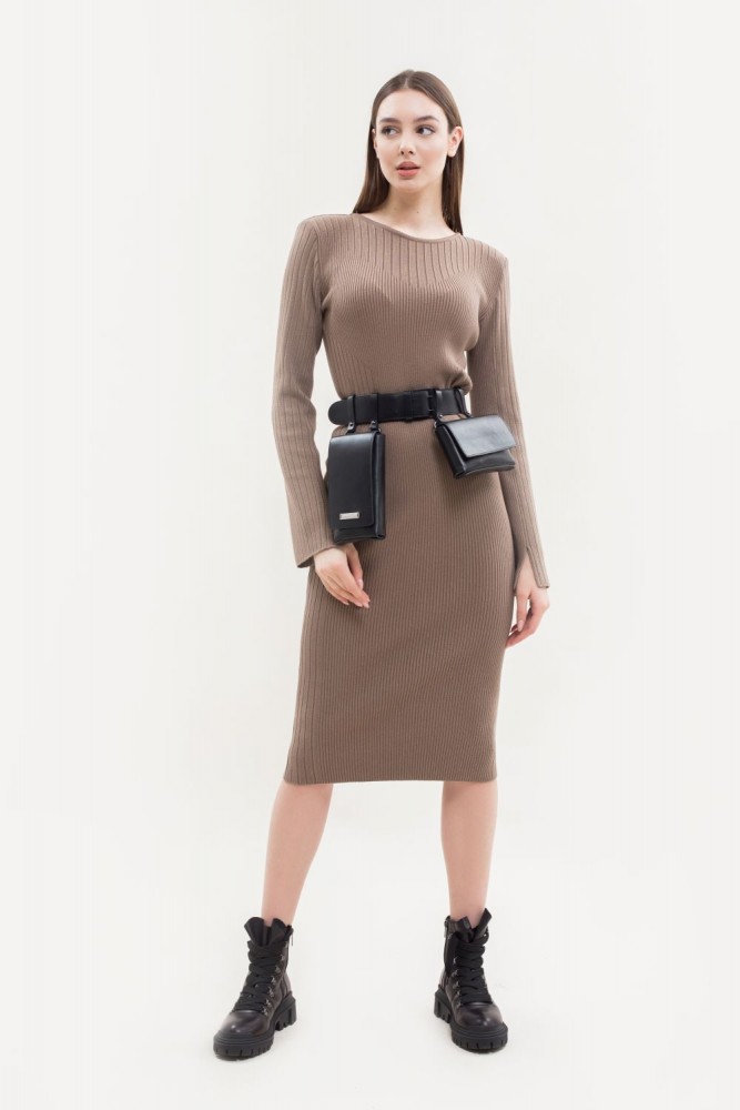 Трикотажное платье связанное лапшой из вискозной пряжи. Прямой рукав с разрезами, в плечах подплечники. Комбинация рубчика разной ширины стройнит и вытягивает силуэт.